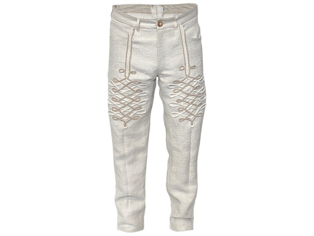Pánske nohavice klasického riflového strihu s vreckami vpredu aj vzadu a pútkami na opasok. Nohavice sú zdobené farebnými šnúrami tak, ako ľudové hološne. Vhodné na bežné nosenie pre pánov, ktorí majú blízko k ľudovým tradíciám. Interný názov nohavíc je "Civilné hološne". Na obrázku sú ušité nohavice z ručne tkaného ľanu, ale krásne vyzerajú aj z ostatných materiálov.